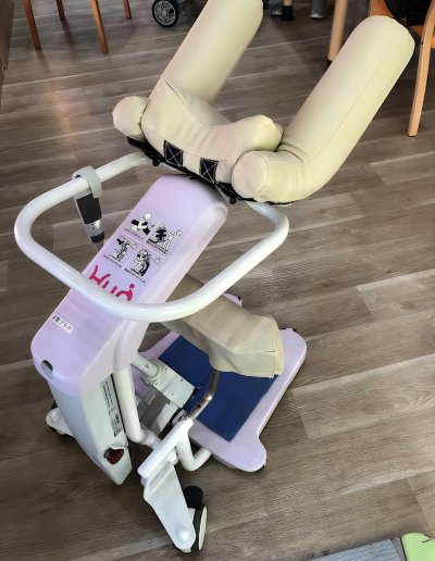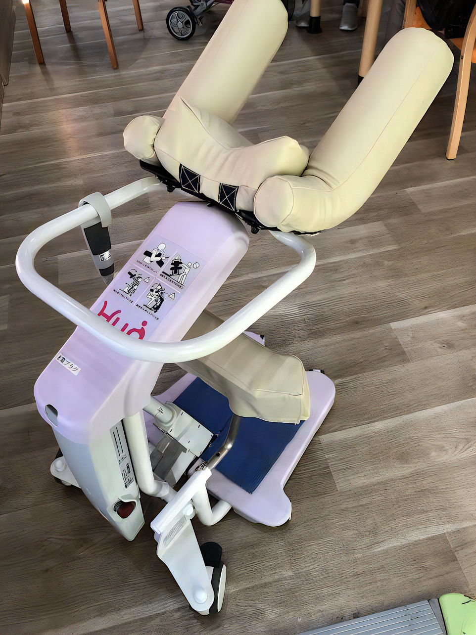 移乗サポートロボットHugはご自身で立ち上がることができなくなってしまった方の座位間の移乗動作、トイレ・浴室などでの立位保持をサポートします。