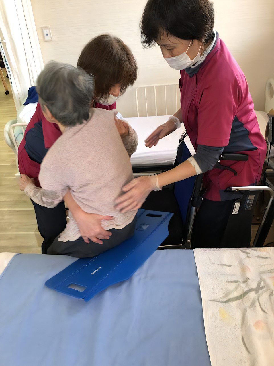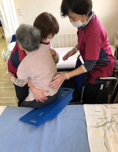 スライディングボードは、ベッドから車椅子への乗り移りなど、介護を受ける方の移動をスムーズにするために使用する介護用品です。自力で立ち上がるのが難しい方でも、座って待つことができる場合に活用でき、介助者の身体的な負担(特に腰痛)を軽減する効果も期待できます。